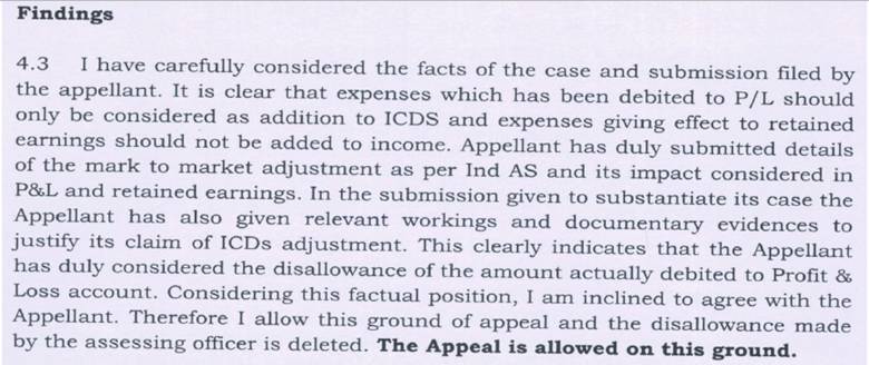 41. We have heard the rival arguments made by both the sides, perused the orders of the Assessing Officer and the Ld. CIT(A) and the paper book filed on behalf of the assessee. We find the Assessing Officer in the instant case made addition of Rs.7,51,15,458/- being the income of the assessee on account of not disclosing the increase in profit due to ICDS adjustment as reported in audit report in Form No.3CD. We find the Ld. CIT(A) deleted the addition, the reasons of which have already been reproduced in the preceding paragraphs. We do not find any infirmity in the order of the Ld. CIT(A) on this issue. The assessee in the instant case has clearly demonstrated that it has correctly computed and disclosed the increase in profit in ICDS adjustment. The assessee before us also demonstrated by drawing our attention to the various disclosures made in the audited accounts and the computation statement. The Ld. DR could not controvert the details given by the assessee substantiating the adjustment as per Indian Accounting Standard, its impact, working and documentary evidences to justify its claim of ICDS adjustment. Therefore, in absence of any distinguishable features brought on record by the Ld. DR we do not find any infirmity in the order of the Ld. CIT(A) on this issue. Accordingly the same is upheld. The ground raised by the Revenue on this issue is accordingly dismissed.