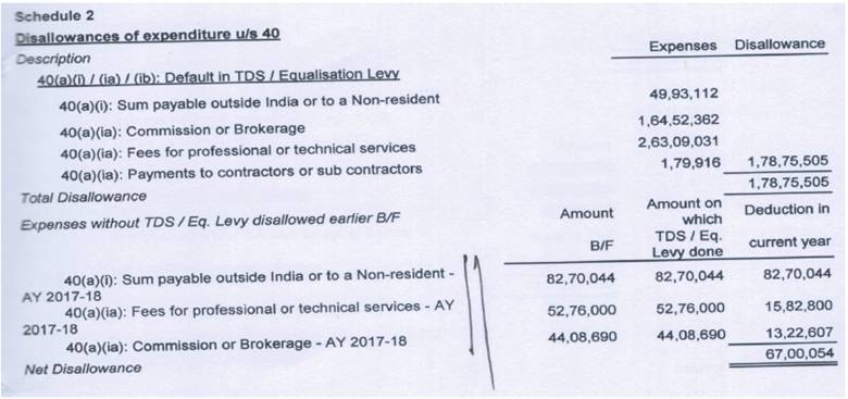 25. The Ld. Counsel for the assessee on the other hand drew the attention of the Bench to page 137 of the paper book which is the statement of income for assessment year 2017-18. Referring to the same he submitted that the assessee has suo motu disallowed an amount of Rs.26,79,740/- u/s 40(a)(ia) and claimed the other deduction as per Schedule 7 of Rs.21,40,57,292/-. Referring to page 139 of the paper book, which is the disallowance of expenditure u/s 40, the Ld. Counsel for the assessee drew the attention of the Bench to the following: