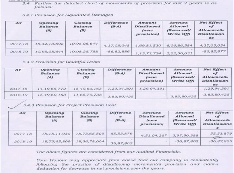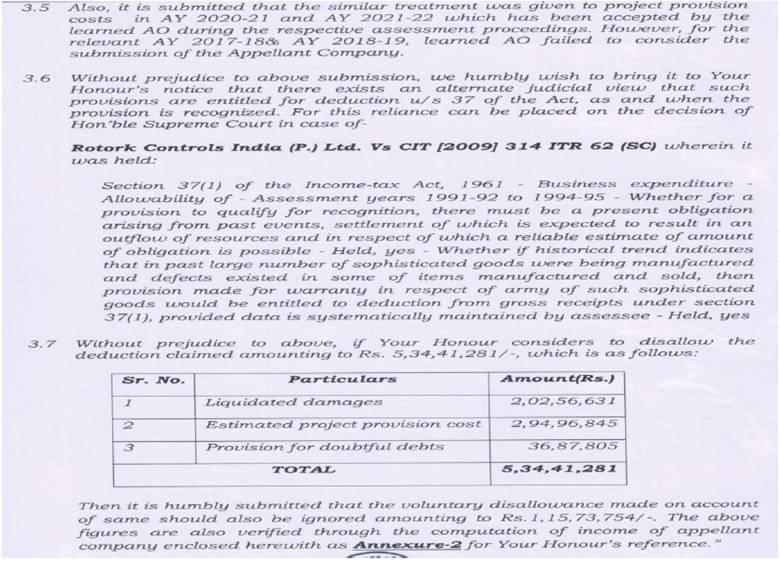 45. It was further submitted that during the relevant year under consideration the assessee claimed deduction of Rs.36,87,805/- on account of provision for estimated projects costs warranty costs. In the assessment year 2017-18, the assessee company disallowed provision for estimated projects cost of Rs.4,53,04,267/- u/s 37 in ITR for assessment year 2017-18. In subsequent year i.e. year under consideration there is reversal of Rs.36,87,805/- out of the above disallowed opening provision. Therefore, the assessee company claimed deduction of the same as the same was already offered to tax in earlier years. It was submitted by the assessee that reversal of liquidated damages of Rs.2,02,56,631/-, provision for doubtful debts of Rs.2,94,96,845/- & project provision cost of Rs.36,87,805/- has been disallowed by the assessee company in earlier years when this provision was made in the books of accounts. These are yearly items of provisions in the nature of contingent which the assessee company disallows in return and reversal, if any, out of it is claimed subsequently.