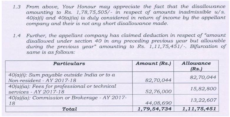 20. It was submitted that the assessee company has claimed deduction in respect of amounts disallowed u/s 40 in any preceding previous year but allowable during the previous year amounting to Rs.1,11,75,451/-, the bifurcation of which is as under: